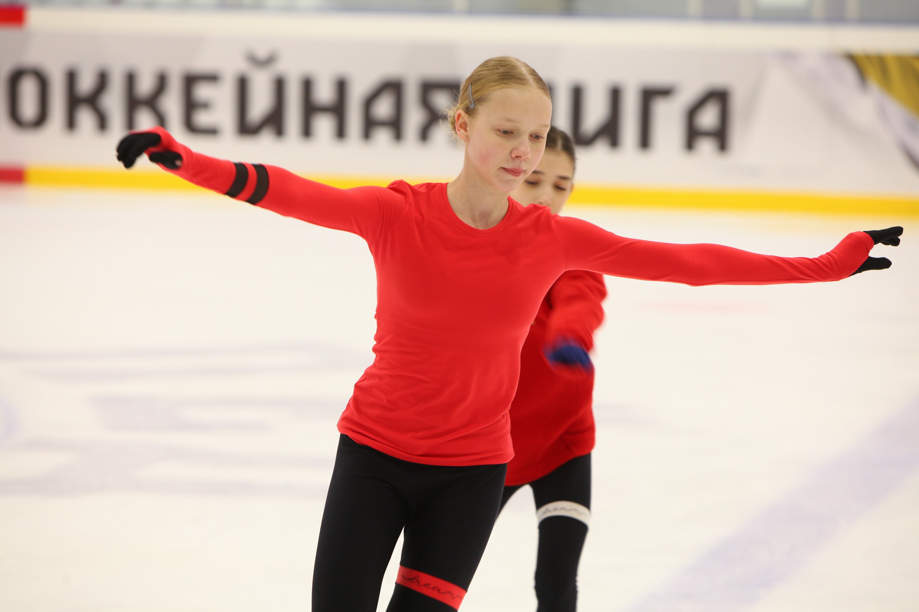 Тренировка включала занятия в зале и на льду, где спортсмены отрабатывали скольжение, вращения и прыжки.