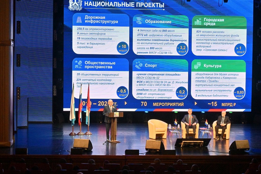 Председатель Хабаровской городской думы Андрей Белоглазов заявил, что позитивные изменения в городе видны воочию, и депутатский корпус готов к дальнейшей эффективной работе. Сенатор Виктор Калашников отметил: «Хабаровск входит в число 25 городов Дальнего Востока, для которых подготовлены мастер-планы долгосрочного развития по поручению президента. Уже реализованы отдельные проекты: построен детский сад на улице Шатова, завершена дорога на улице Героев Пассаров, запущен этап реконструкции двух бульваров. Важнейшие стратегические инициативы — развитие микрорайона «Хабаровск Сити» и комплексное освоение острова Большого Уссурийского острова. Значимую роль играют национальные проекты: средства направлены на поддержку молодёжи, семей, создание комфортной городской среды. Совет Федерации как палата регионов уделяет особое внимание развитию муниципалитетов, поскольку именно местная власть ближе всего к решению насущных проблем граждан».