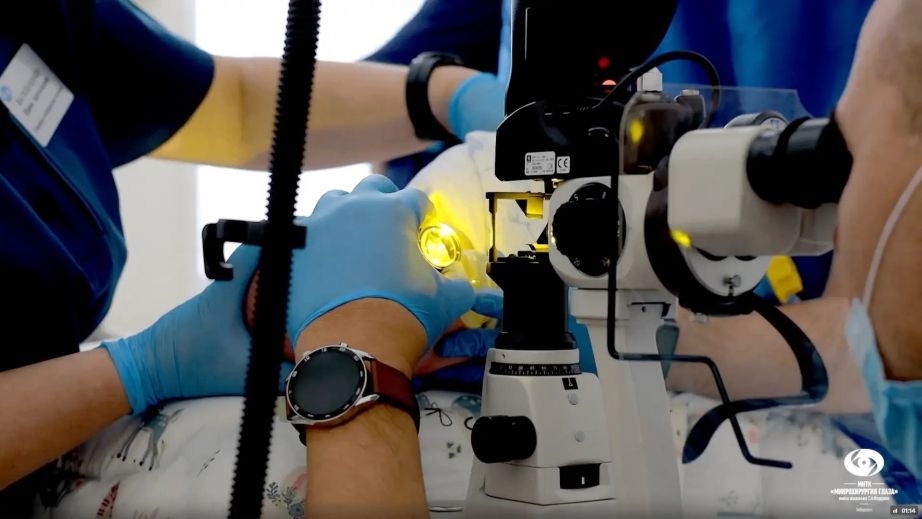 Специалисты выбрали комбинированную тактику. Директор филиала кандидат медицинских наук Максим Пшеничнов выполнил лазеркоагуляцию сетчатки на одном глазу. Заведующий отделением витреоретинальной хирургии №1 Николай Мащенко провел эндовитреальное вмешательство через микроскопический доступ 27G: убрал спайки между стекловидным телом и сетчаткой и дополнительно обработал глаз лазером. Такой подход минимально травмирует нежные ткани детского глаза.