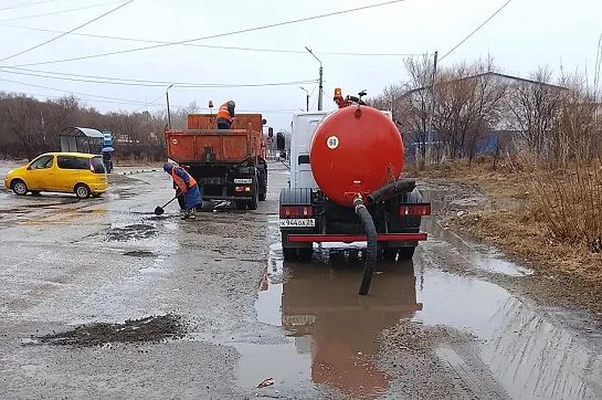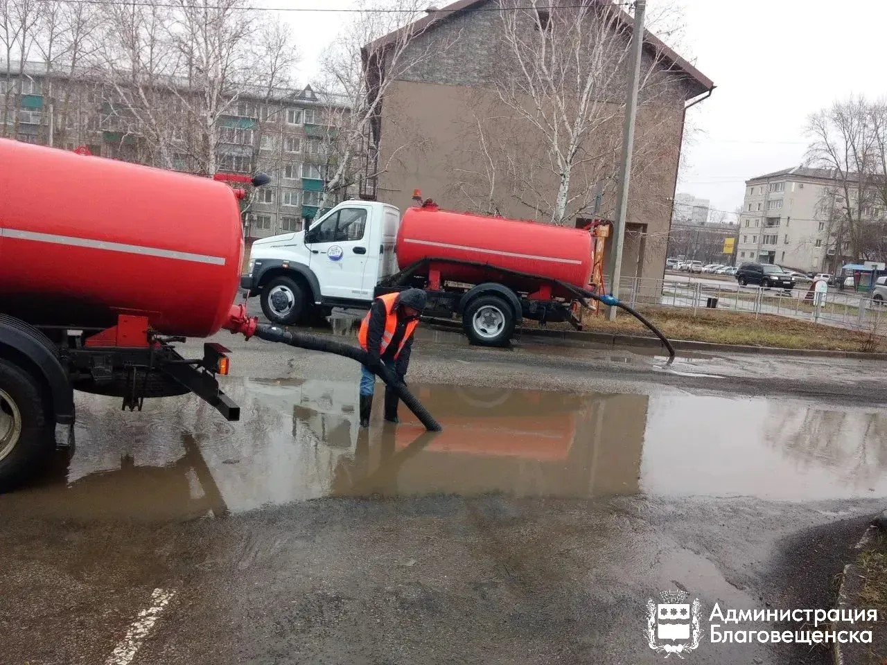 Три вакуумные машины откачивают воду с семи подтопленных участков в Благовещенске.