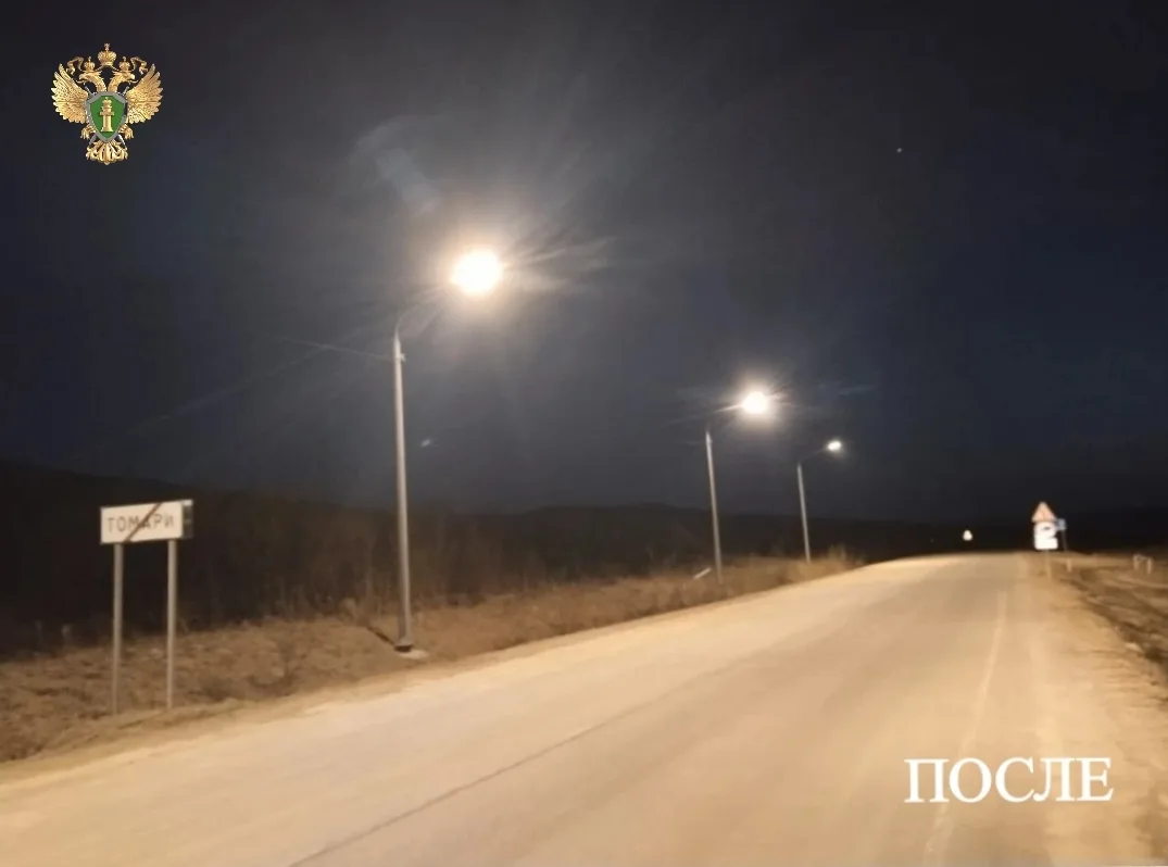 На въезде в Томари появилось освещение после вмешательства прокуратуры