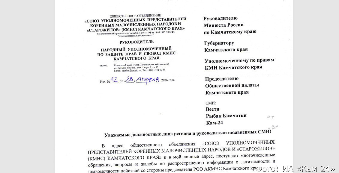 Общественное объединение направило в информационное агентство «Кам 24» письмо с требованием прояснить, кто на данный момент возглавляет ассоциацию КМНС Камчатского края. В обращении, датированном 29 апреля 2026 года, ставятся под сомнение полномочия действующего руководства организации.