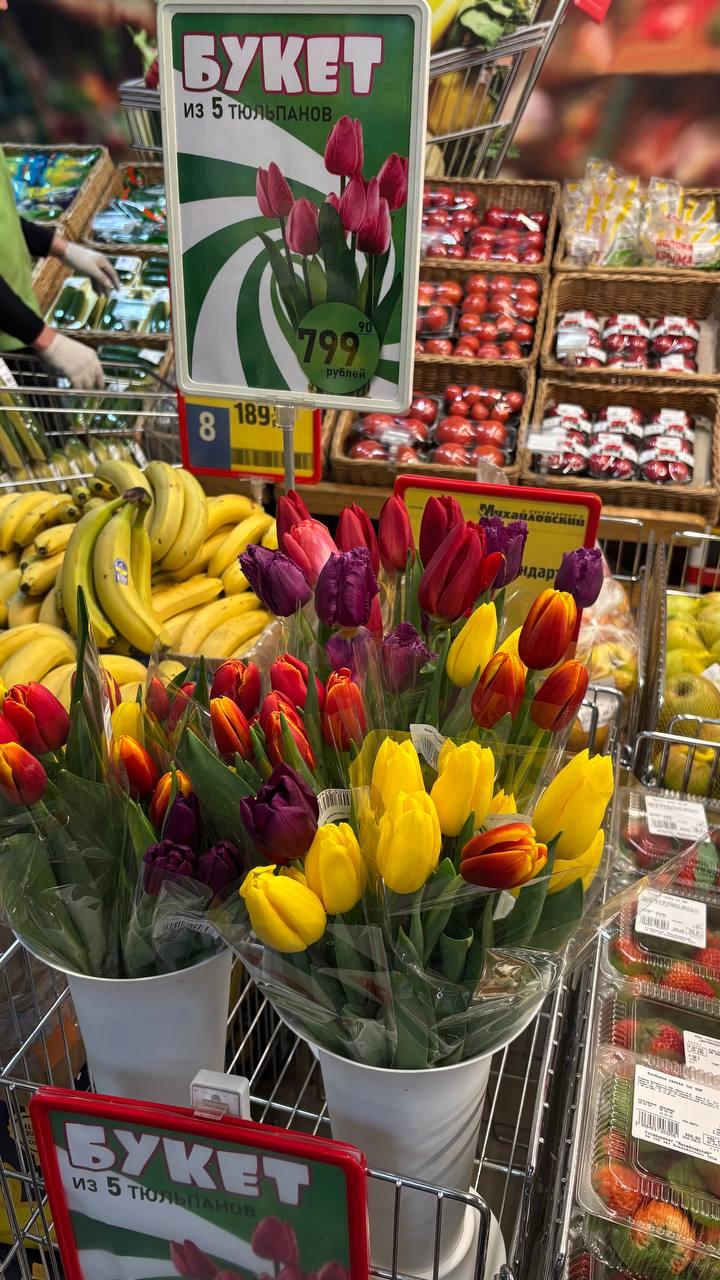 Наиболее доступные цветы можно найти в супермаркетах. В сети «Реми» один тюльпан продаётся за 99 рублей 90 копеек. В некоторых магазинах, например в «Самбери», запасы уже закончились. А в супермаркете «Михайловский» на Калинина набор из пяти тюльпанов оценили почти в 800 рублей, что составляет около 160 рублей за штуку.