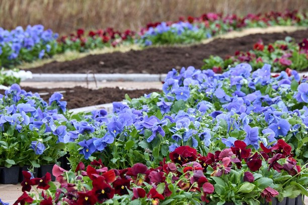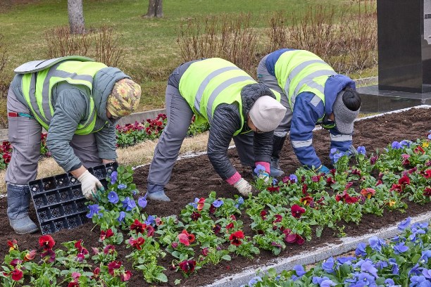 В среду бригады приступили к посадке в сквере у мемориала Славы. У аллеи Героев Советского Союза высаживают семь тысяч виол — белого, синего и красного цветов.