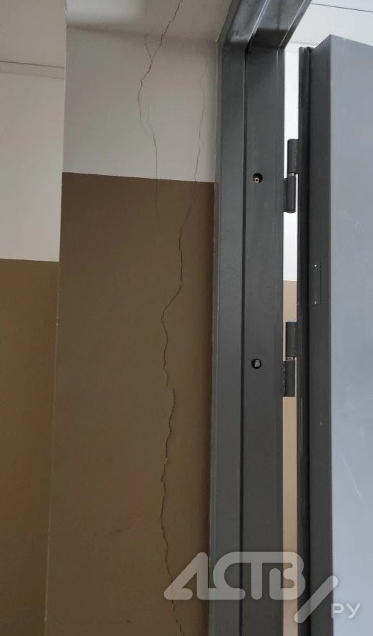 Обладатели квартир, полученных по программе переселения из ветхого и аварийного жилья, отмечают целый ряд недостатков. Помимо протечек, в здании наблюдаются сбои в работе отопления, а у входной двери в подъезде появились трещины.