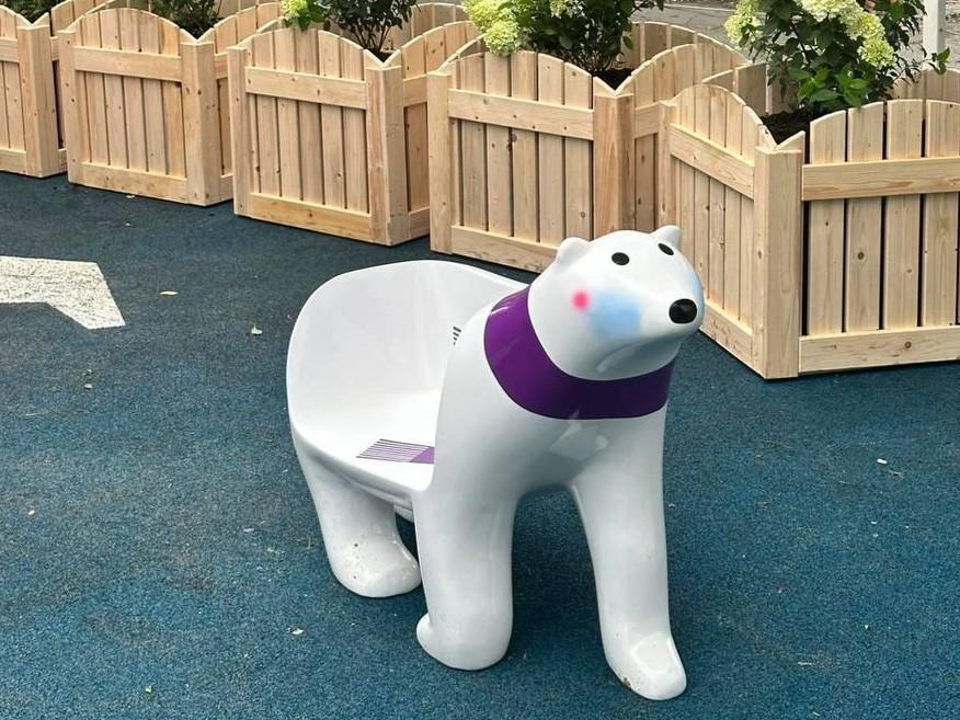 Фигура медведя в фиолетовом шарфике служит маскотом фабрики мороженого «Урса» и используется как небольшая лавка для посетителей. Скульптура весит около 25-30 килограммов и сделана из пластикоподобного материала с наполнением.