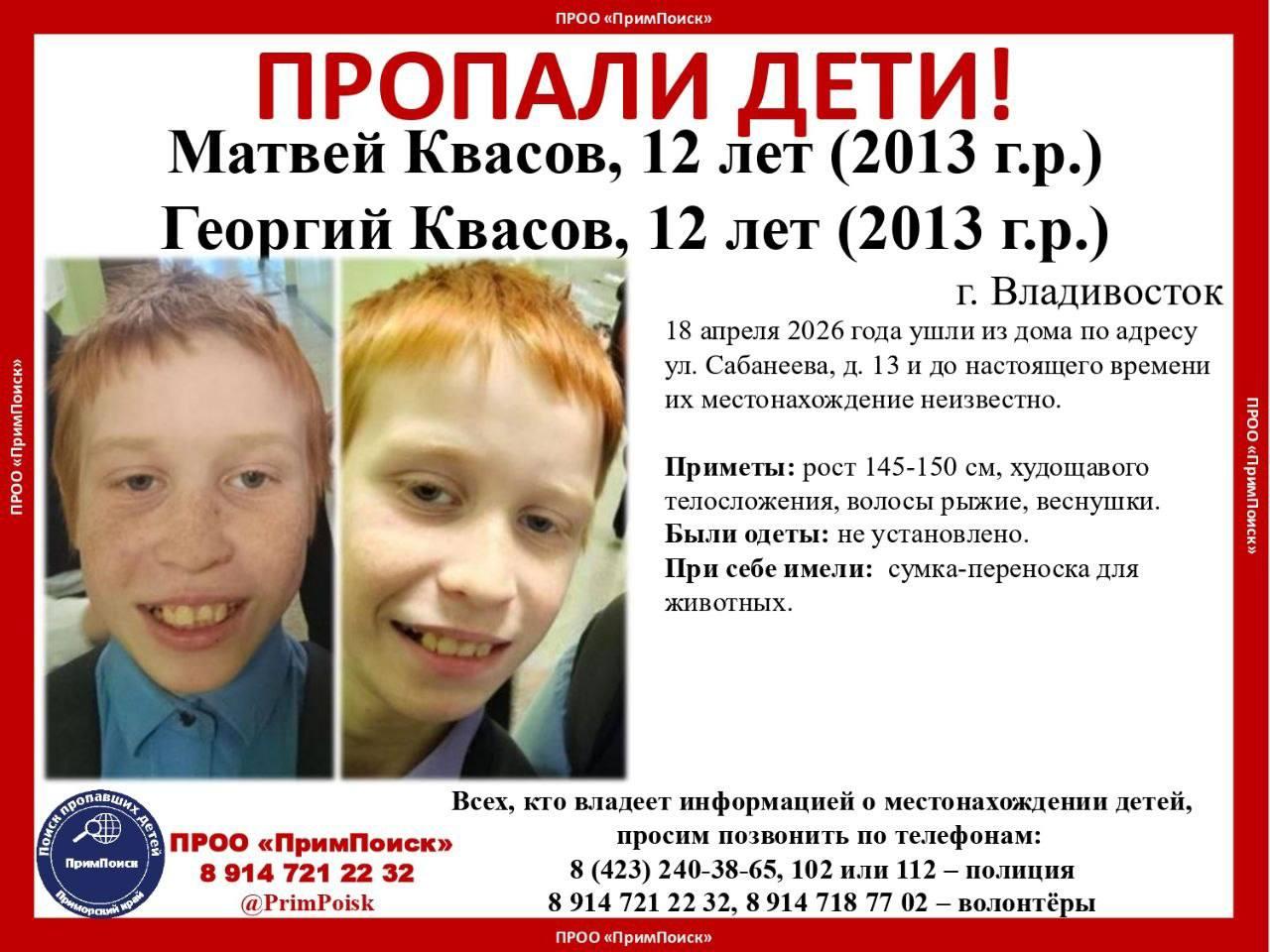 Матвей и Георгий Квасовы, 12 лет, ушли из дома на улице Сабанеева, 13 во Владивостоке 18 апреля 2026 года и с тех пор не выходили на связь.