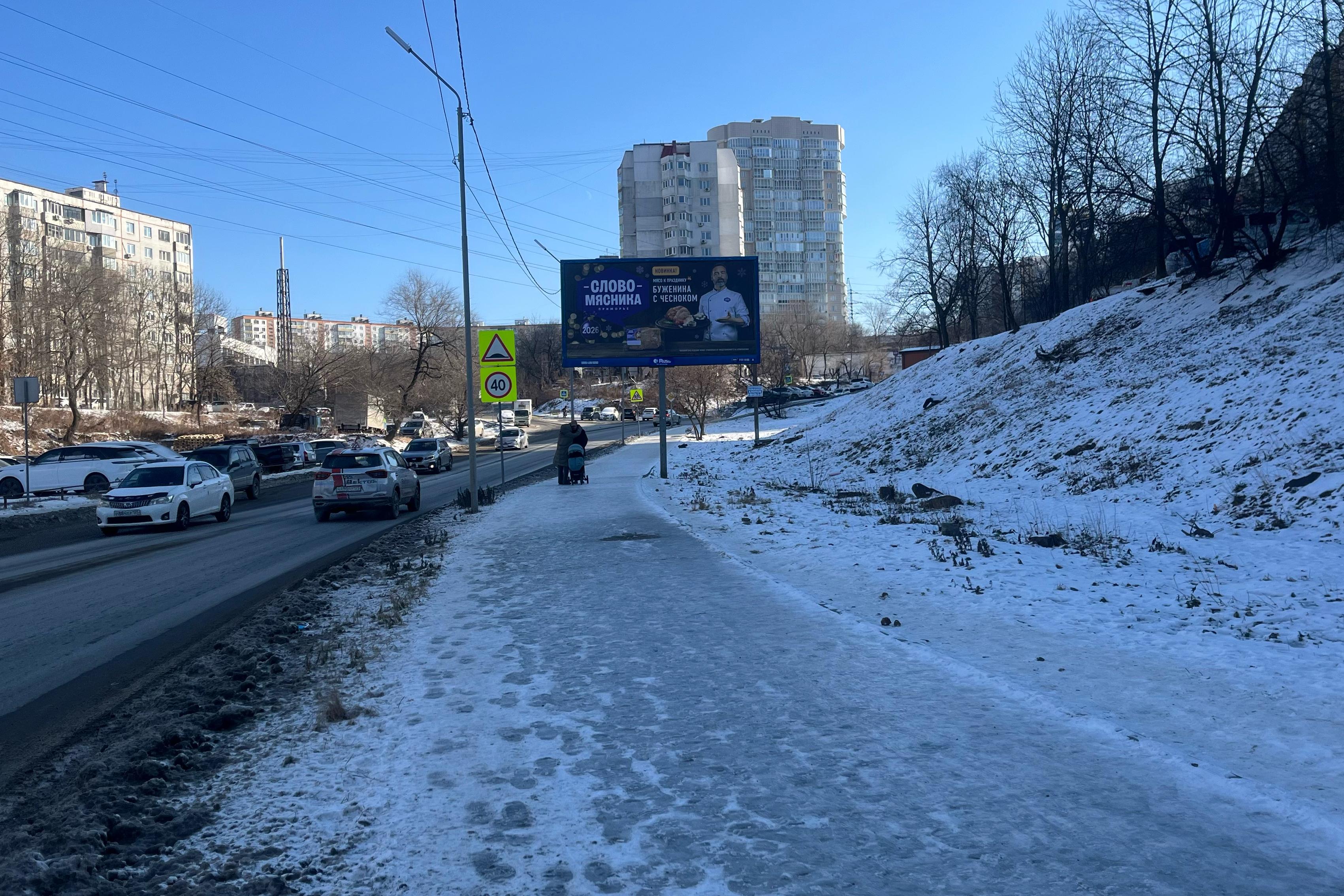 Третий день подряд Владивосток столкнулся с сильным обледенением. Практически все тротуары, пешеходные зоны и пути к остановкам общественного транспорта покрыты толстым слоем льда. Из-за мороза до –20,4 °C и порывистого северного ветра прогулка по городу стала рискованной.