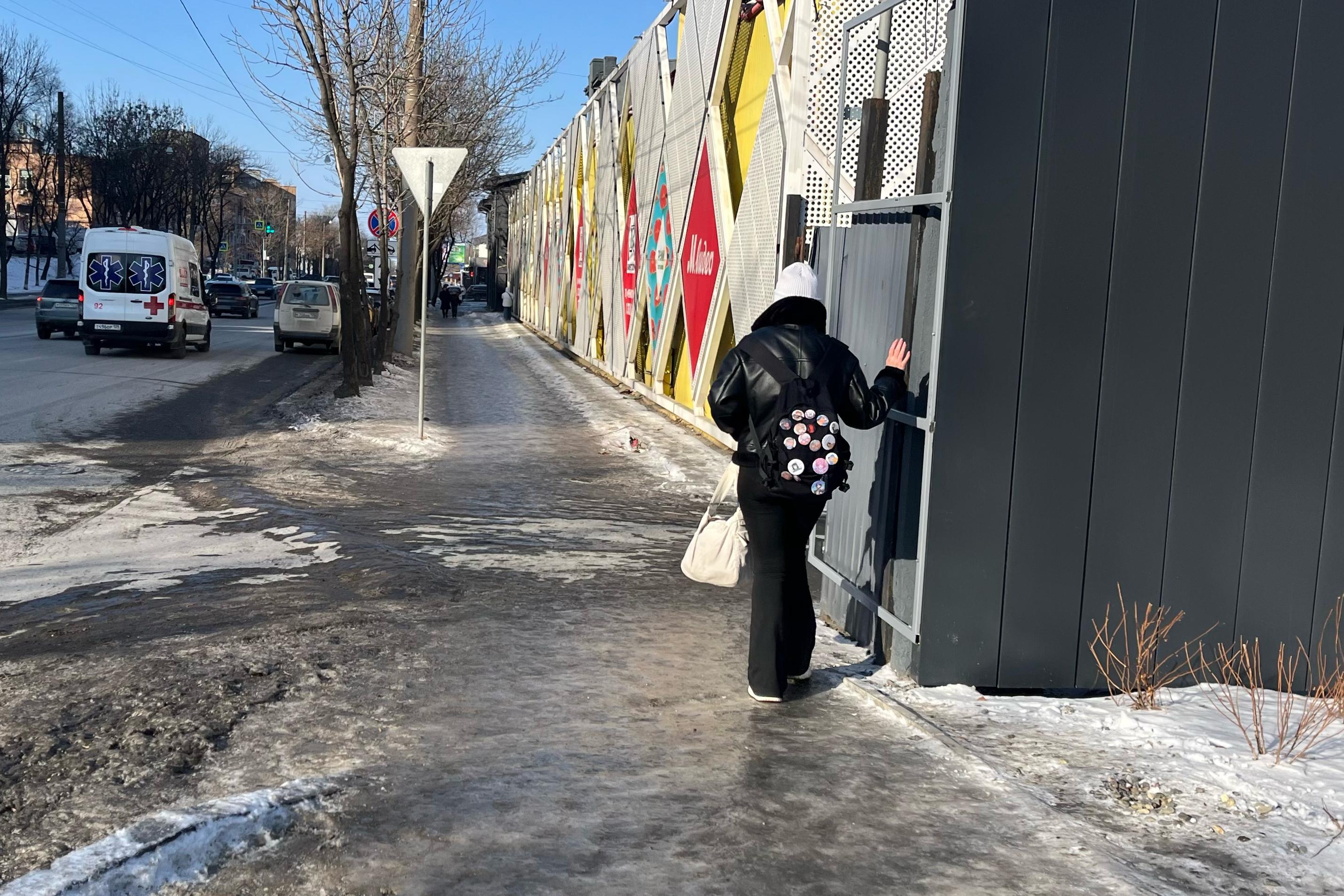 Опасность подстерегает и на улице Котельникова. Тротуар от автобусной остановки до домов укрыт ледяными наростами. По словам местных, противогололёдные материалы здесь не применялись — лёд остаётся чистым и блестит на солнце.